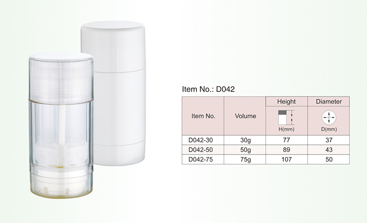 Description: D042 is single wall Deodorant stick container,all parts are injected.It has 30ml 50ml 75ml volume for your choice.Color and print can be customized. it is perfect for Deodorants,antisudorific. MOQ is 20,000pcs for customized.Suitable for middle and top grade cosmetic packaging skin care products packaging. |