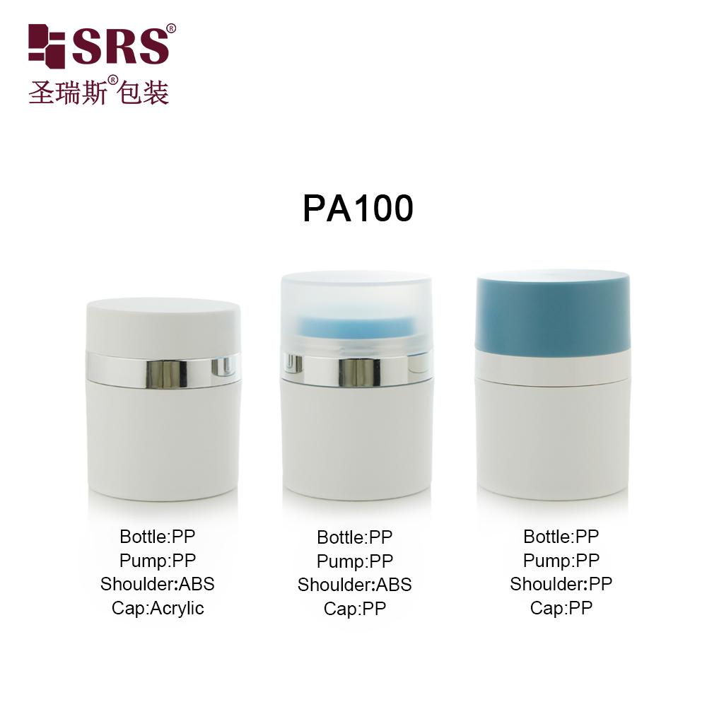 PA100-C is double wall replaceable airless pump cream jar,all parts are injected.It has 50ml volume for your choice.Color and print can be customized.